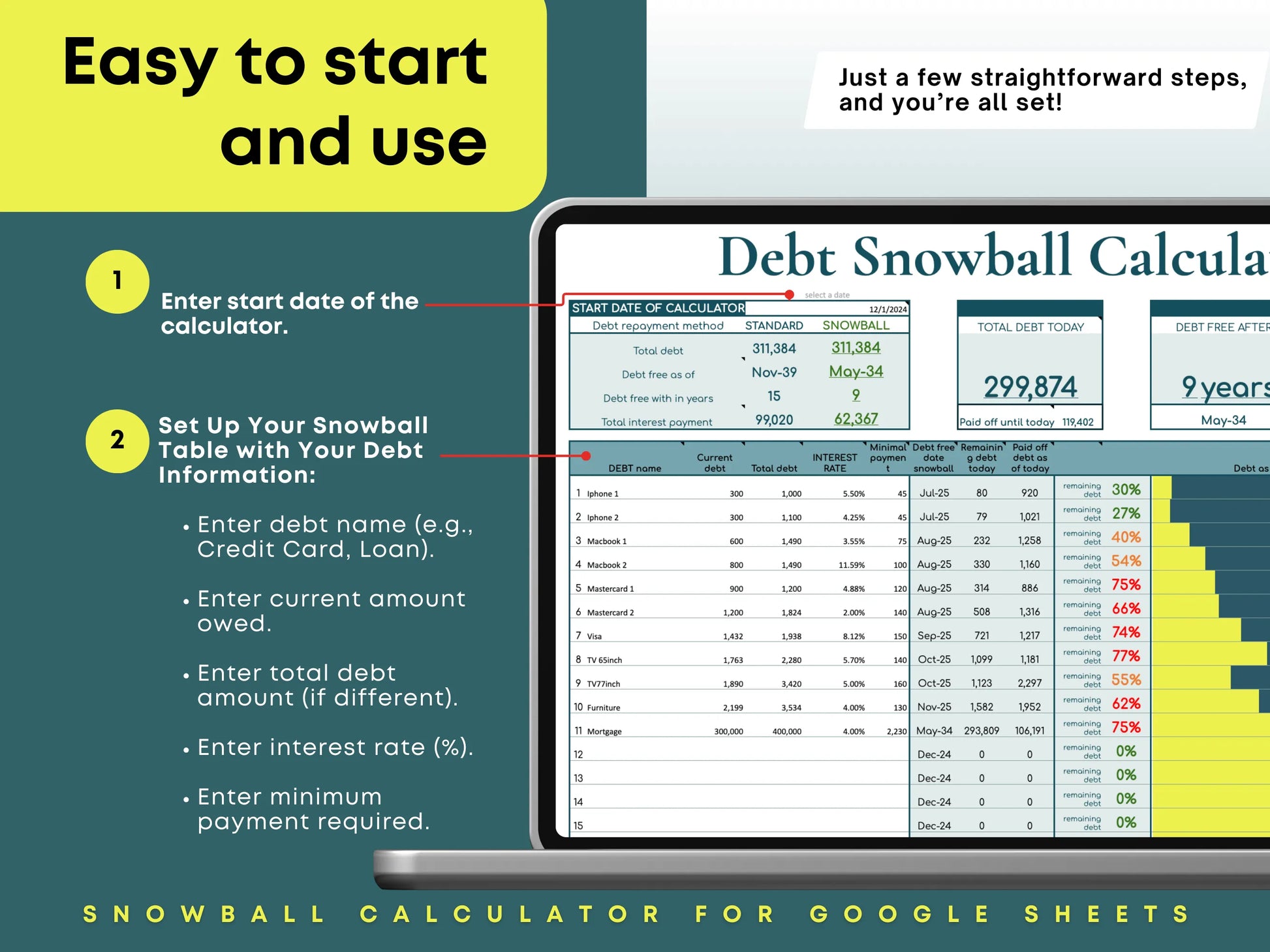 • 1 Debt Snowball Method Calculator Template (Compatible with Google Sheets)