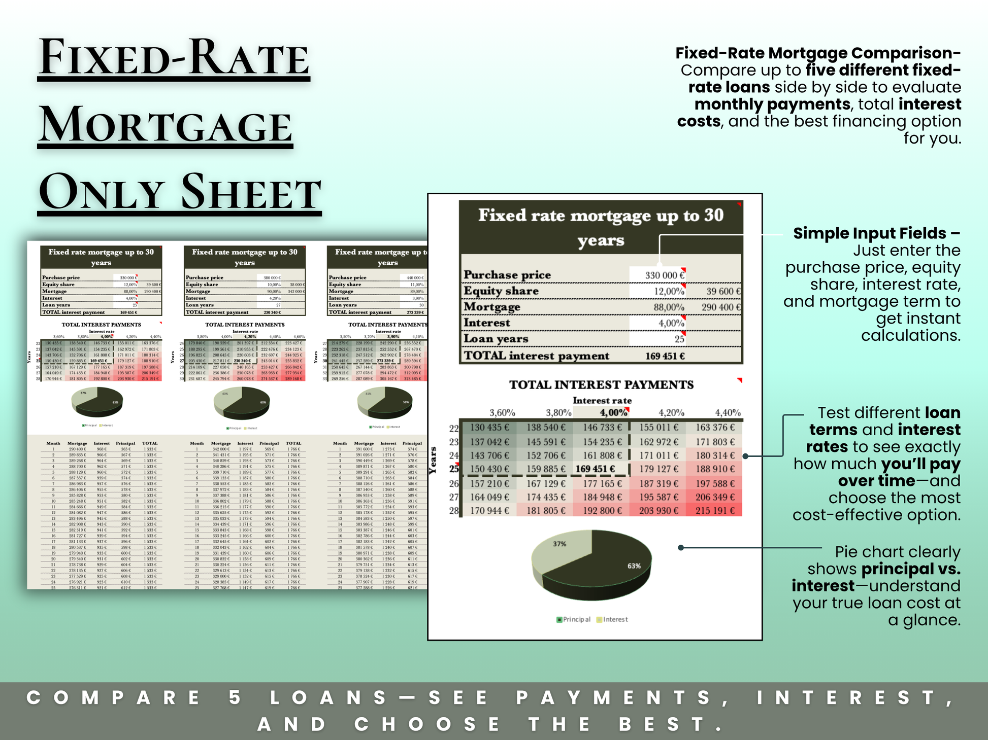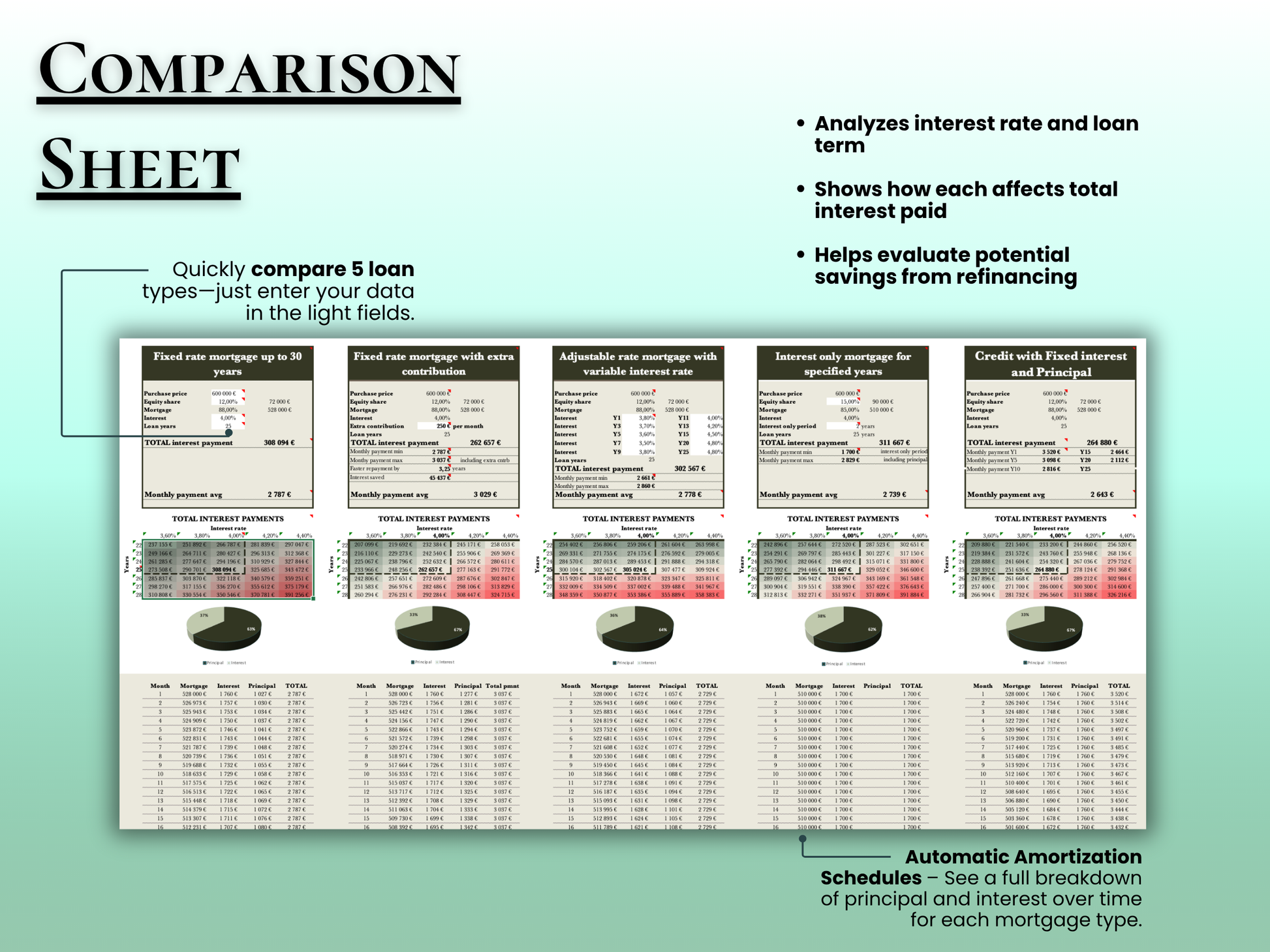 Make confident and informed mortgage decisions with this comprehensive Mortgage Comparison Calculator, built in Excel for easy use and accuracy. This tool allows you to analyze and compare five different loan options, helping you determine the best financing solution for your needs. With automated calculations and clear breakdowns, you can see the total cost of each loan, including interest, monthly payments, and overall savings.
